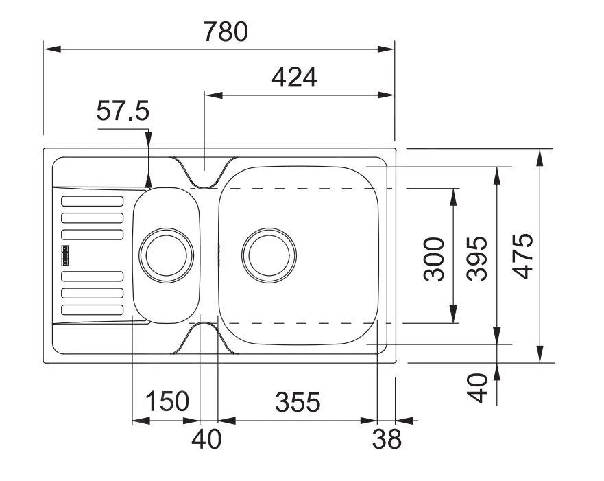Rvs spoelbak EFN 651-78, met afdruipdeel, omkeerbaar