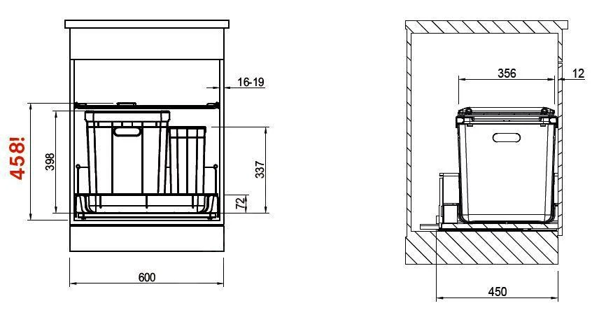 De afvalemmers uit 350, Trolley Vario en Easysort serie worden geplaatst in een behuizing met uittrekmechanisme. De behuizing is voorzien van een reling en hoge zijwand. Voor deze afvalemmers raden wij de volledig uittrekbare systemen Blum, Grass of Hettich aan.